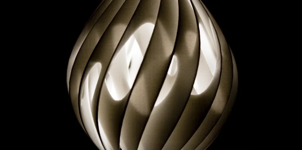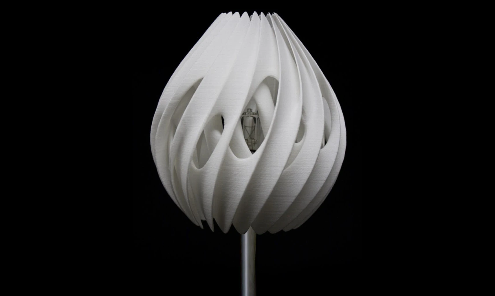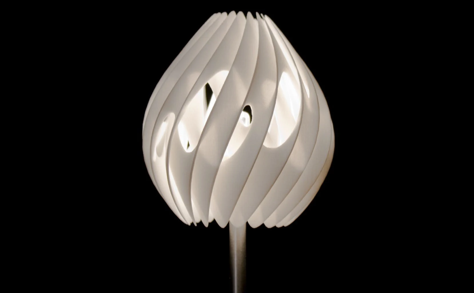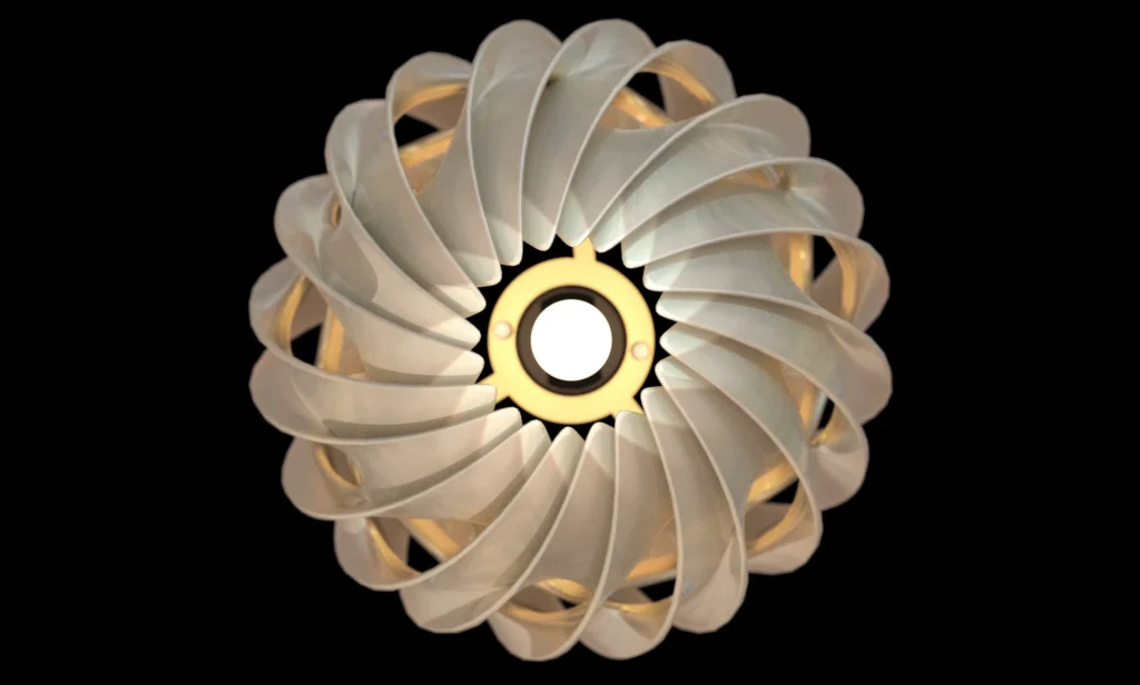 The initial driving mission of the VOVA Lamp was to push the boundaries of the selective laser sintering 3D printing technology. This allowed the VOVA lamp’s concept to be feasibly driven and developed using a minimal surface tiling algorithm optimizing the object’s form and the lamp’s function. Once a base module was formulated, the geometry was tiled radially 10 times and resulted in a continuous flow of material.
